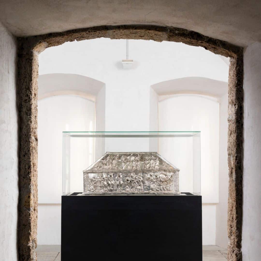 Le Pénitencier accueillera pour quelques mois des œuvres uniques comme le reliquaire carolingien d’Althée (vers 800) ou la grande châsse de la cathédrale de Sion (milieu du XIe siècle), la plus ancienne de ce type conservée en Suisse. Elle possède encore une partie de son décor de plaques d’argent montrant des scènes de la Passion. Ces deux reliquaires font partie des principaux objets de dévotion de la liturgie catholique à Sion jusqu’au 20e siècle. Des calices, ciboires, ostensoirs et croix de procession rappellent quant à eux l’art gothique et les fastes du baroque dans une installation évoquant les armoires de sacristie.